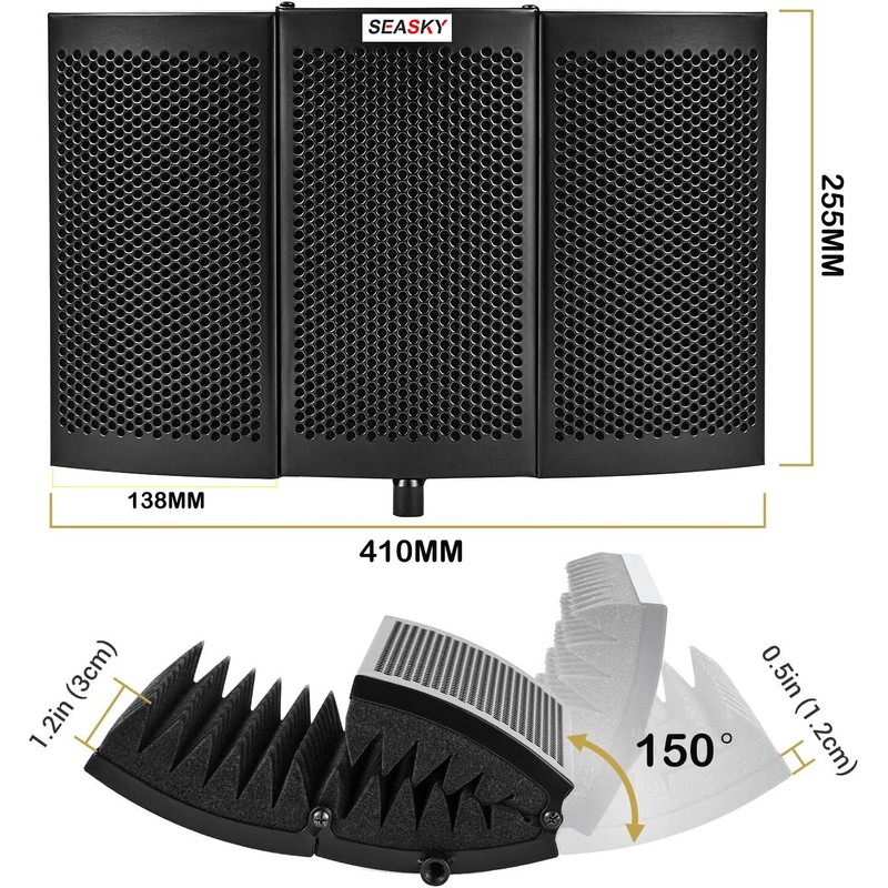 - 🎤Conjunto profesional de alta calidad:El kit de insonorización de micrófono de grado profesional SEASKY está compuesto de espuma absorbente de sonido de alta densidad, cubierta acústica insonorizada de micrófono de 3 lados de metal + soporte de metal triangular de escritorio + anti- red contra salpicaduras, y está conectado por tornillos de metal de alta resistencia y varillas de soporte, para garantizar un rendimiento duradero, estable, profesional e intacto.