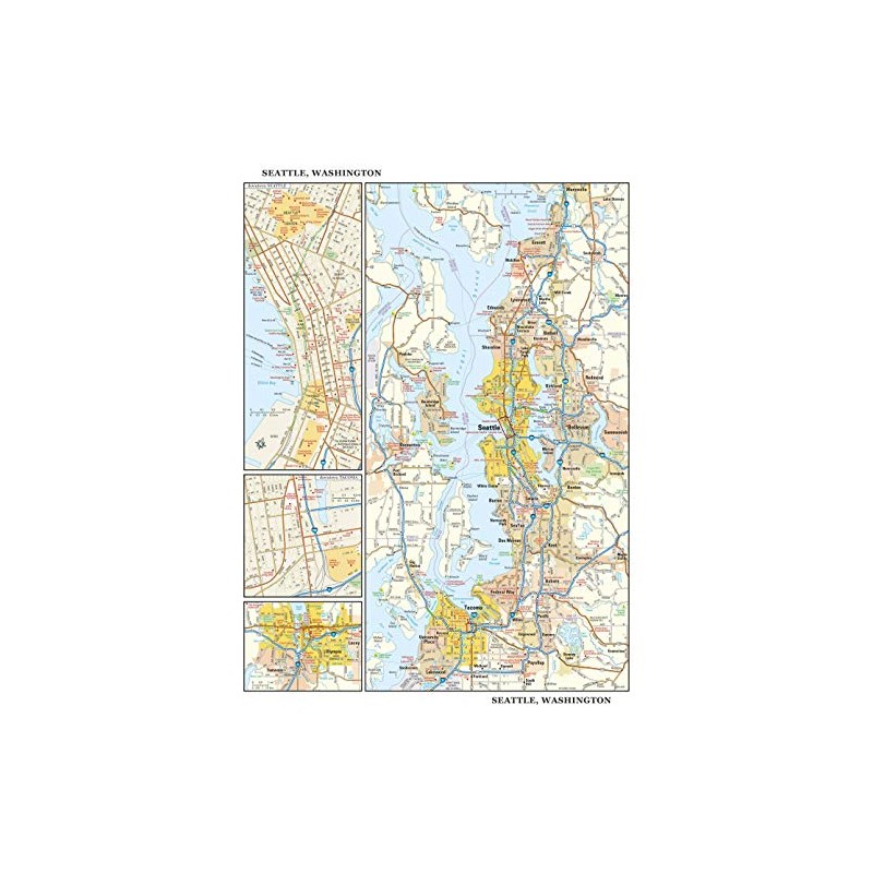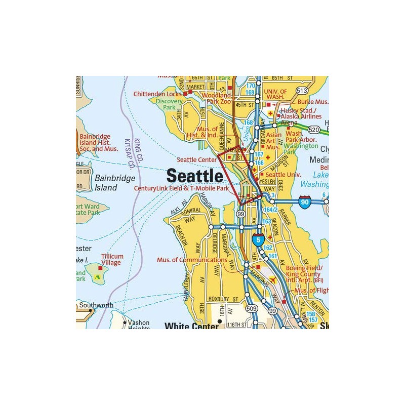 • Bainbridge Island, Bremerton, Bellevue, and Everett are among the cities surrounding Seattle that are featured on the Seattle regional map. The highly detailed insets of central Seattle and Tacoma show highways, streets, parks, landmarks, and other points of interest. The Seattle Center, Belltown, and Pioneer Square are among the neighborhoods featured on the downtown Seattle map. Also available in a small size of 14.50" high X 11.25" wide