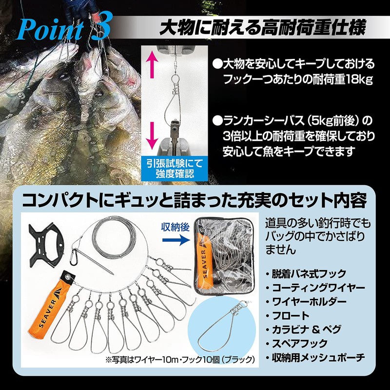 - (High Load Capacity Specifications) Each hook has a load capacity of over 3 times more than 3.9 lbs (18 kg), so you can keep fish caught with confidence. Tensile tested by a Japanese inspection agency to ensure durability