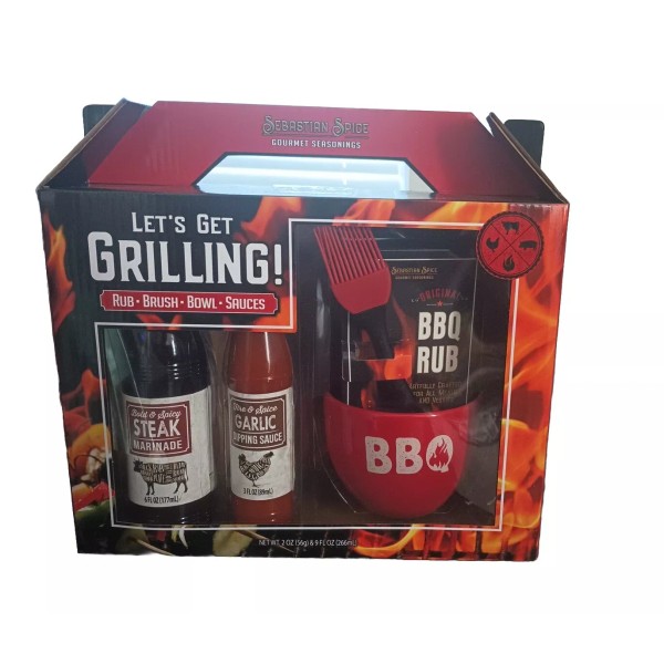 The Sebastian Spice Get Grillin' BBQ Seasoning and Sauce Gift Set is a flavorful collection perfect for gifting during the holidays. It comes complete with recipes and usage tips to make the most each unique sauce and seasoning, which are: Original Recipe BBQ Rub, Body & Spicy Steak Marinade, and Fire & Spice Garlic Dipping Sauce. Includes basting brush and bowl to make grilling even easier! The handled box makes it an easy to grab and go gift to take to your next gathering!
