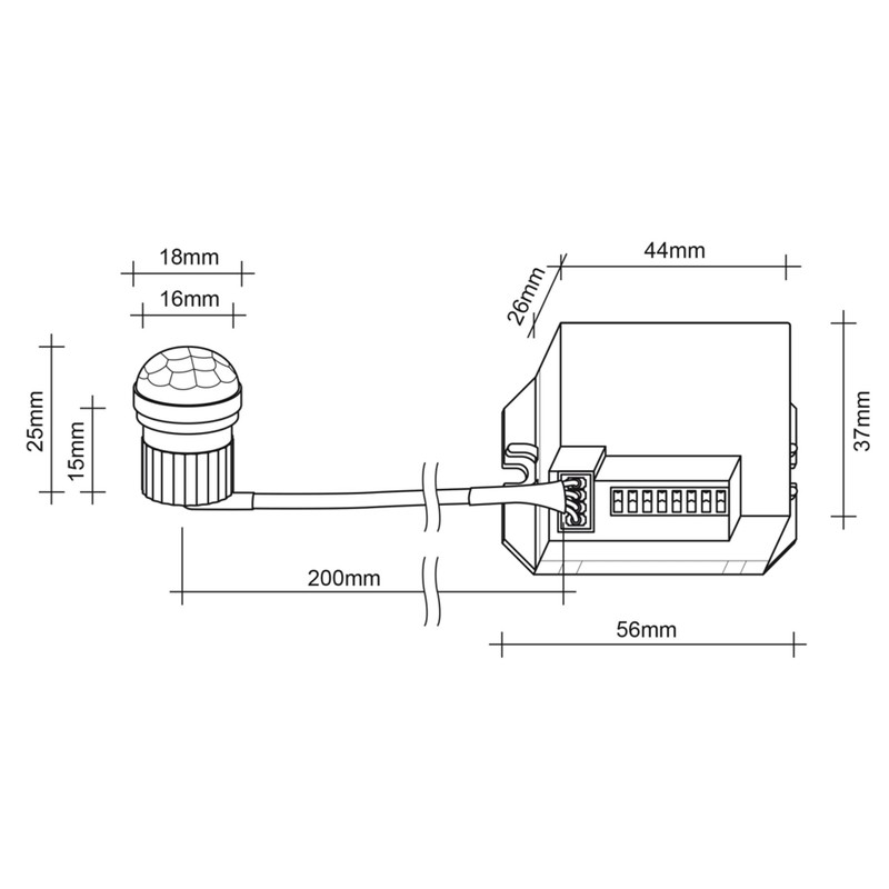 - SEBSON Mini motion detector for indoor use, dimensions switch 56 x 37 x 26 mm and sensor diameter 18 x 25 mm.