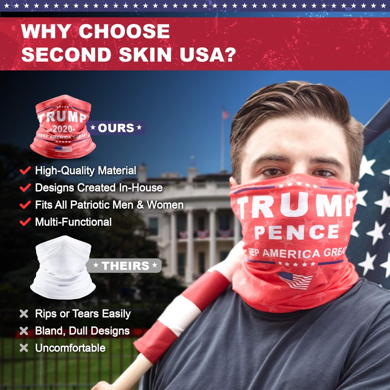 Second Skin USA Trump 2020 Face Mask Neck Gaiter - Unisex Multifunctional - Bandana for UVA UVB Protection
