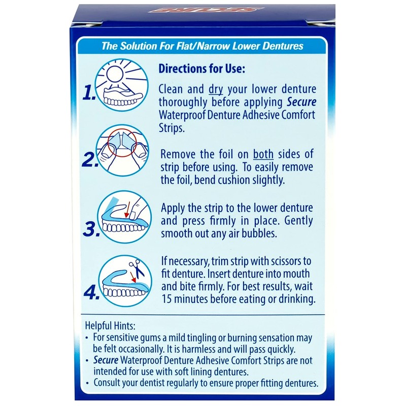 - EASY APPLICATION - Apply in the morning and don’t worry all day, it is that easy. Start with dry dentures and a dry mouth to create a good bond. Feel free to cut strips to a comfortable size, remove backing from both sides of the strip, press firmly in place to remove any air bubbles and wait fifteen minutes before eating or drinking.
