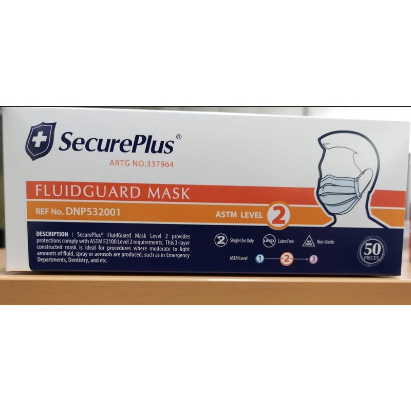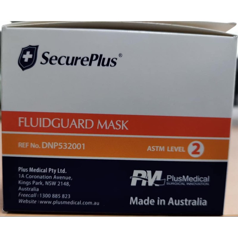 SECURE PLUS (50pcs x 3 boxes) Fuildguard Face Mask w/Earloop - ASTM Level 2 Face Mask,Made in Australia,Blue