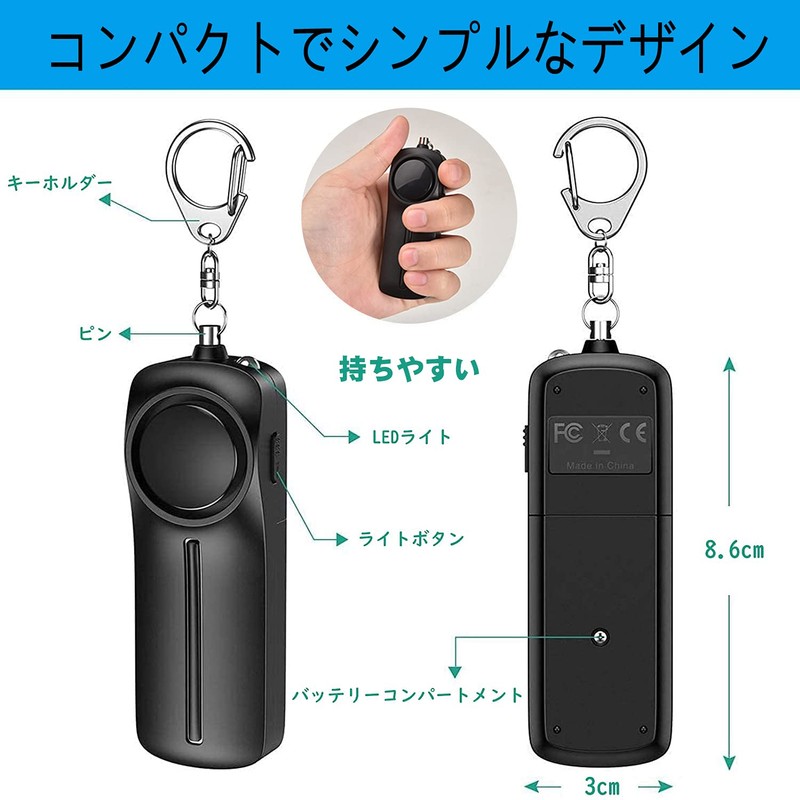 - (130 dB Loud Security Alarm) The security alarm is an item that will surprise your opponent with a loud sound and get the opportunity to escape, so loud voice is a focus. This security alarm provides a loud 130 dB (measuring distance of 3.3 ft (1 m)) that can be detected even by people from a distance, thus increasing peace of mind during emergencies. Alarm sound lasts up to 6 hours