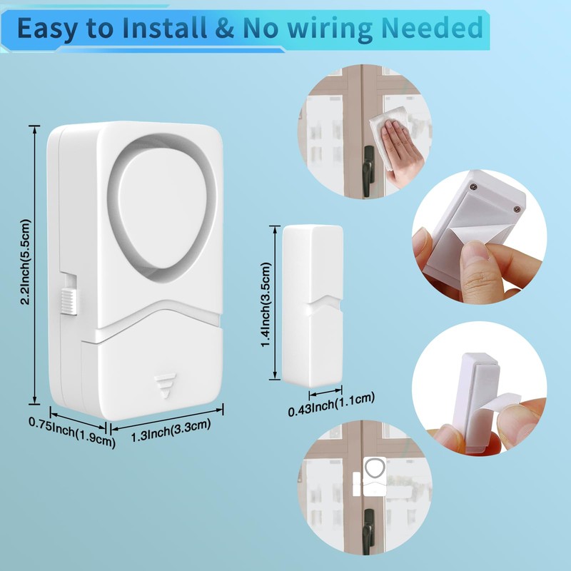 - 【Easy Installation】 No wiring required! No screws needed! Double-sided tape included! Window security alarm comes with LR44 batteries and tape. The window security alarm can be easily installed with tape. Easily mounted to a window or door with the included double sided tape. Note:Please make sure the gap between the alarm and the magnetic sensor is no more than 0.39 inches.