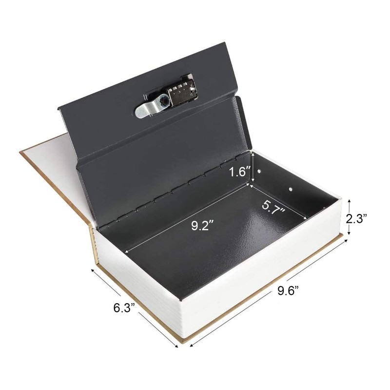 • PORTABLE DESIGN -- With the size of 9.6*6.3*2.3inch,this special book-shaped safe box can be easy to take with you. With key lock,safe and secure only you and your trusted one can open it. More protection for dear friends,safe and secure. Open book to reveal a secret storage compartment,Perfect for home, office,school,travel,Rv's and boats.