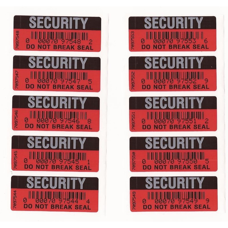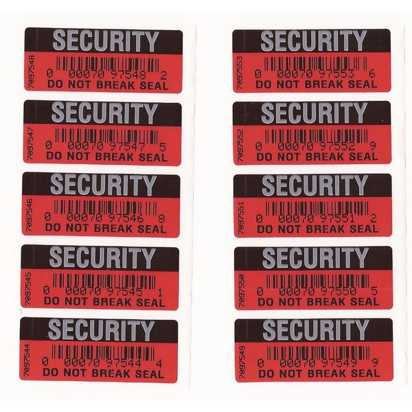 100 X RED "Do Not Break Seal" security labels. [Black printing on red substrate, with the word "Security" in white printing on a black band of substrate]. Tamper-evident labels / stickers. Each label has a UNIQUE SKU serial number and SKU code printed upon it. Perfect for maintaining the security of your items and PROACTIVELY preventing warranty, 'dodgy returns' and RMA fraud. Allows you to completely secure and identify your products. Tamper-evident: label self-destructs, cannot be re-applied, and leaves the message "VOID OPEN" in RED print on a WHITE film background when someone attempts to remove it. Visual evidence of tampering remains. The wording is "SECURITY", "DO NOT BREAK SEAL", with a matching SKU serial number and SKU code, UNIQUE per each label. Code is a fully working SKU and is excellent for scanning stock inventory etc. Size: 50mm wide by 20mm high. 100 Labels Supplied. Materials: RED and BLACK PET film front, with RED AND WHITE total transfer pattern release-film. Please allow 2 to 3 hours for the labels to "cure" before testing.