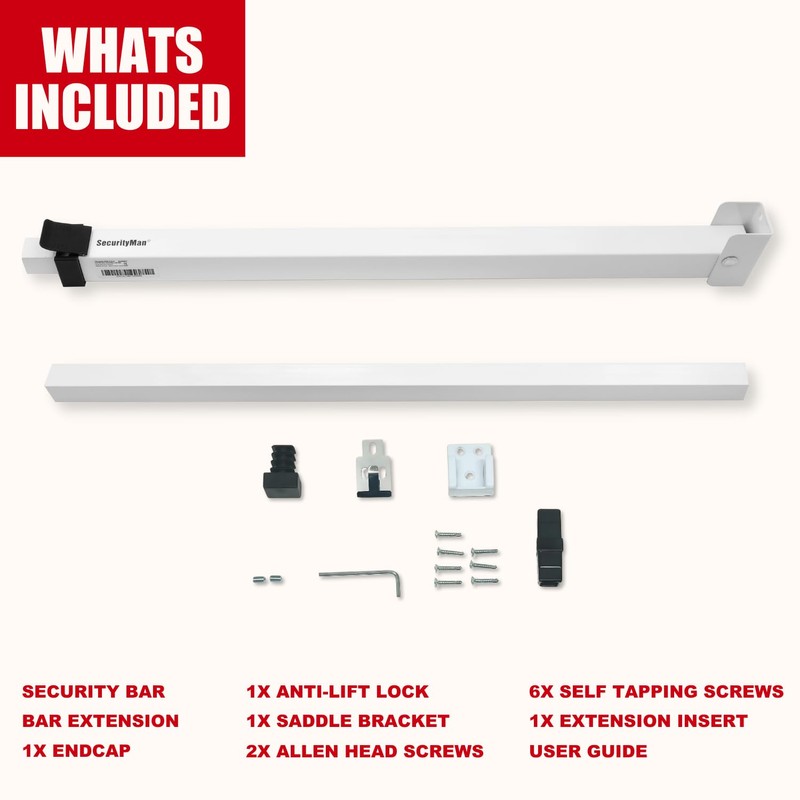 - What's Included: Sliding Glass Door Security Bar (2 Parts), Anti Lift Lock (2 Parts; Metal Plate & White Saddle Mount), Double-Side Threaded Screw, 4X End Caps (Black, Plastic), 5X Flathead Screws, User Guide, 12 Month , & Friendly Customer Support