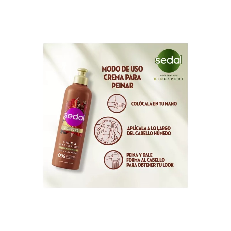 Para mejores resultados, úsala con el Shampoo y la Crema para Peinar Sedal Café y Óleo de Ricino. Sedal acompaña a las mujeres en cada desafío y oportunidad ayudándolas a tener un cabello saludable, fuerte y bien cuidado, en un mundo vibrante y en constante cambio. Nuestra línea Café y Óleo de Ricino está formulada sin siliconas, sin parabenos y sin colorantes. Además, nuestras botellas están hechas de plástico 100% reciclable. El logo de aprobación de PETA significa que Sedal no testea en animales en ningún lugar del mundo. *Basado en la reducción del quiebre, usando Crema para Peinar Sedal Café y Óleo de Ricino vs. shampoo sin ingredientes acondicionantes. **Basado en el crecimiento natural del cabello. Vs. la fórmula sin tecnología acondicionante, en cabello decolorado.