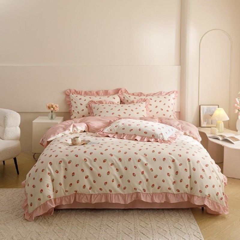Sedefen Bed Linen 135 x 200 cm with Ruffles Pink Strawberry Pattern Reversible Microfibre Bed Linen Oeko-Tex Certified & Suitable for Allergy Sufferers, 1 Duvet Cover and 1 Pillowcase 80 x 80 cm