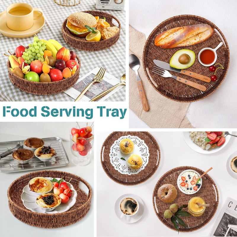- Two Practical Size: The package includes 2 set of round rattan serving trays with handles. And there are 2 sizes to meet your various needs: 12.6 in diameter * 2 in height, 13.8 in diameter * 2.2 in height