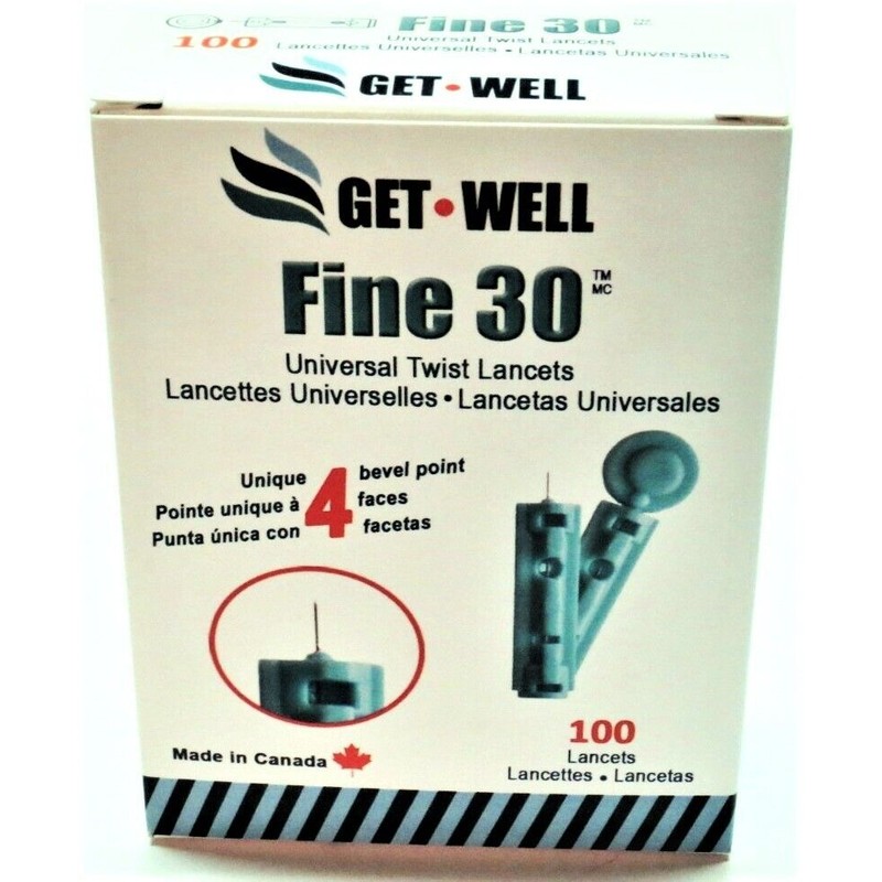 - 100 GetWell Fine 30g Universal Twist Lancets. Made In Canada.