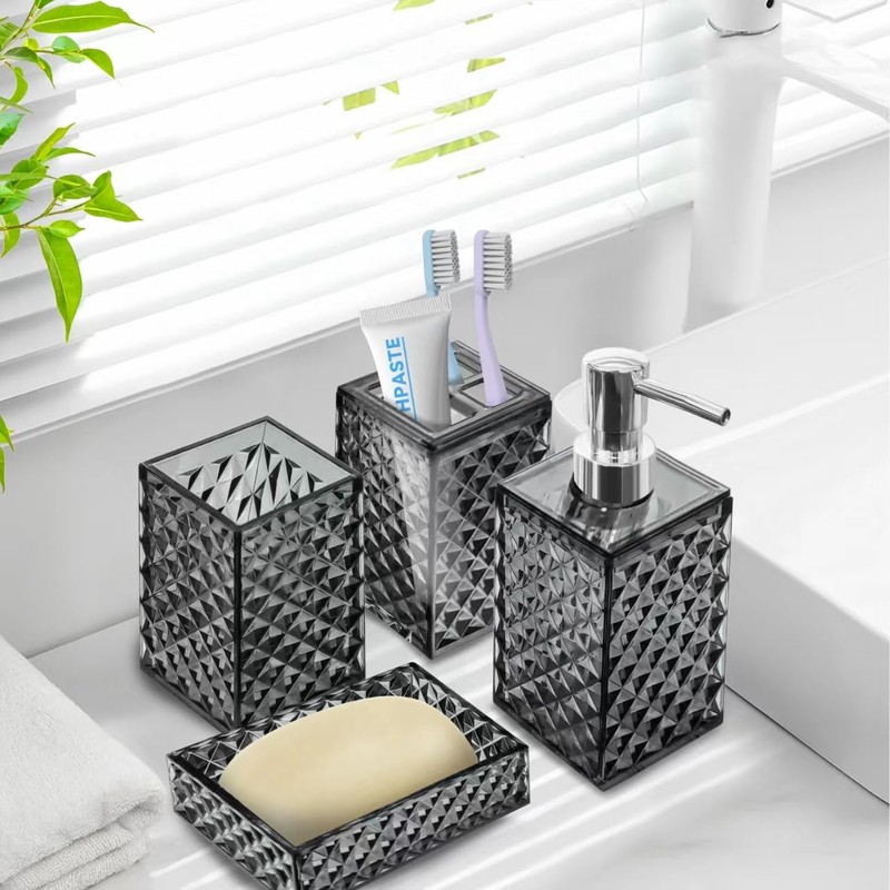A suit contain 1 soap dispenser, 1 toothbrush holder, 1 toothbrush cup, 1 soap dish,which can meet basic bathroom supplies storage needs.