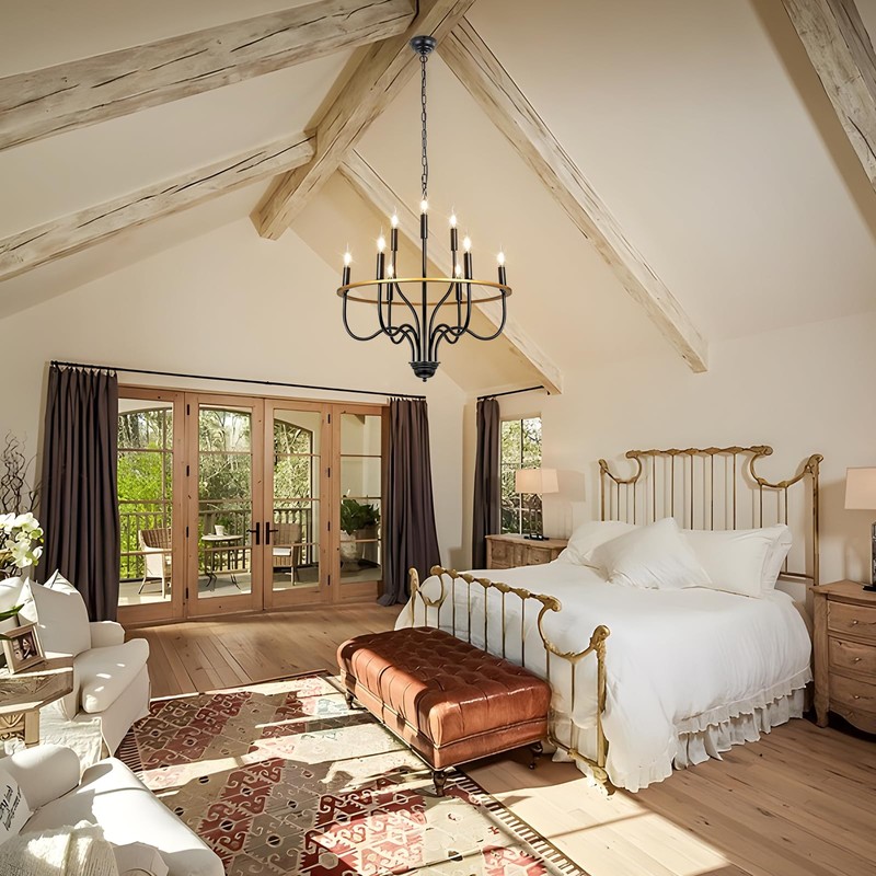 - Classic Farmhouse Charm:Crafted from durable metal, this farmhouse chandelier features a classic candle-inspired design with arms elegantly extending upwards. The striking contrast of black and gold adds a unique aura, making it an eye-catching centerpiece for any room.