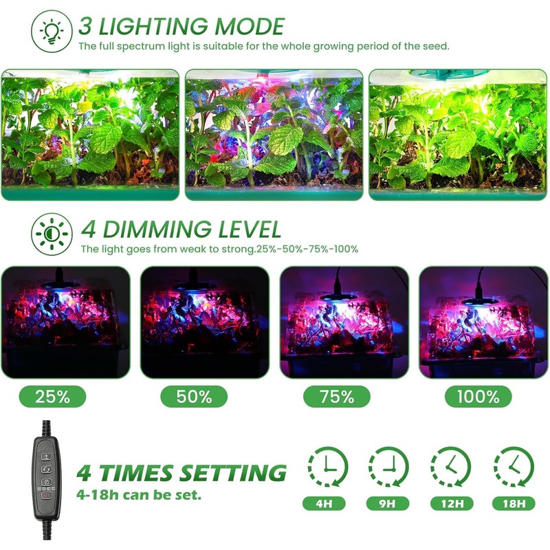- [3 Lighting Modes]: Different from other growth lights that can only provide white light, we have doubled the light bead and switched the light mode function, a total of three lighting modes: 1. White light; 2. Blue + Red Lights; 3. White + blue + red Lights. The addition of blue and red light can promote the root growth of seedlings. Blue light can inhibit the long legs of seedling, and red light plays an important role in stems and leaves, as well as flowering and fruit.