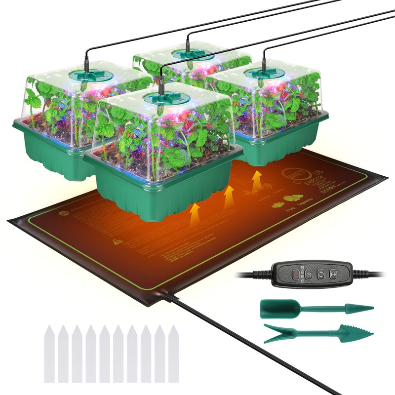 - [ Value Seed Starter Kits]: It includes: 1* heat mat for seedling start, 4*12 cells seedling trays and 4 grow lights. Which can provide lights and heat to the seedlings. There are 3 lights: white light, blue light, red light. It is suitable for starting seedlings that love lights. Such as: basil, rosemary, mint, herds, tomatoes, pepper shoots, strawberries, etc.