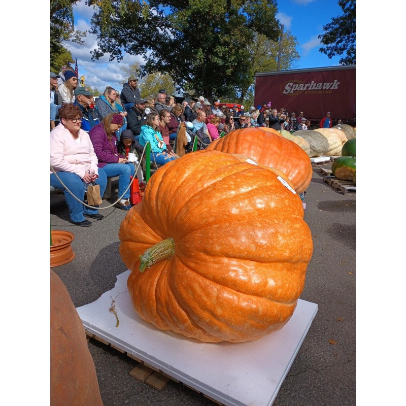 Each order will receive 2 seeds from the beautiful pumpkin shown in the pictures. I grew this pumpkin in my yard and it weighed 656lbs. The genetic lineage in this pumpkin (1002 Ailts) ( X self ) consistently produces pumpkins that look like this (sometimes even darker orange) They grow tall Pinwheel style fruit with deep ribs and beautiful sunburst pattern, smooth glossy skin. Whenever I've seen pumpkins from this genetic lineage show up at a weigh off, it wins the prettiest pumpkin award ( Howard Dill award ) and this fruit was no exception! It easily won the Howard Dill award and the Gary Keyzer for prettiest pumpkin! If your goal is to win one of them awards at a weigh off then this is the seed you want to grow!