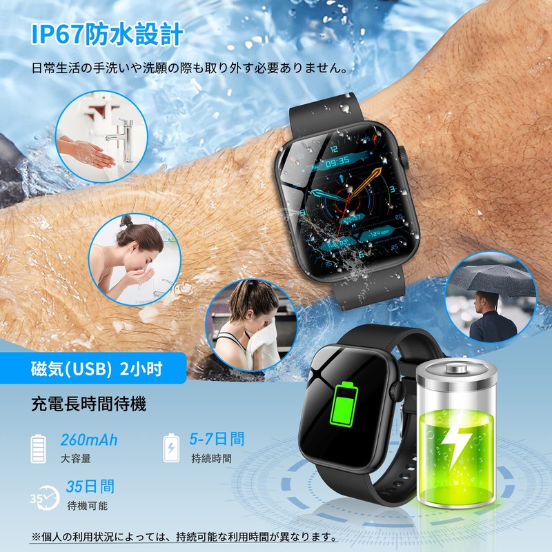 - IP67 Waterproof & Durable Battery: IP67 grade waterproof and dustproof, so it is resistant to sweat, rain, and splashing water. No need to take it off when washing hands or face in daily life. Please do not wear it in high temperature environments such as baths, saunas, hot springs, hot springs, or high water pressure. This smart watch is equipped with a 260 mAh high capacity battery, which provides about 5 to 7 days of usage time and 36 days of standby time on 2 hours of charge Eliminates the hassle of frequent charging. Connect the included magnetic charging cable to the charging terminal of your smart watch to start charging. (Sustainable usage time may vary depending on individual usage)