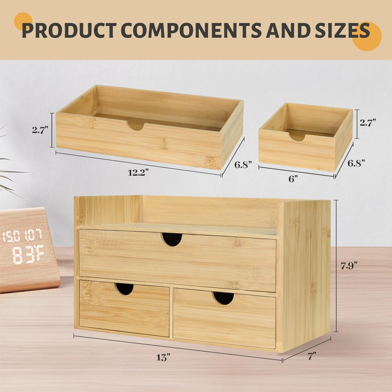 - [MULTIPLE STORAGE SPACE]: No assembly required. Overall size of the desktop organizer with 3 drawer: 13x7.1x7.87 inches. Ample storage capacity and clever design, according to the size of the small drawers to store the corresponding items in it. Keeps items in order and keeps life organised.