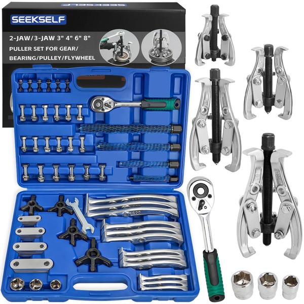 - Professional Puller Set: SEEKSELF Pullers are forged from high-strength heat-treated CrV steel, and equipped with thickened connecting plates and non-slip spacers for light/heavy duty work. It also comes with a labor-saving torque wrench and sockets, detailed instruction manual, sturdy blow-molded storage box and beautiful packaging.