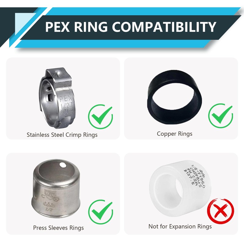 - VERSATILE COMPATIBILITY: Suitable for various plumbing systems. Compatible with all types of PEX Tubing, Stainless Steel Clamp & Copper Crimp Ring