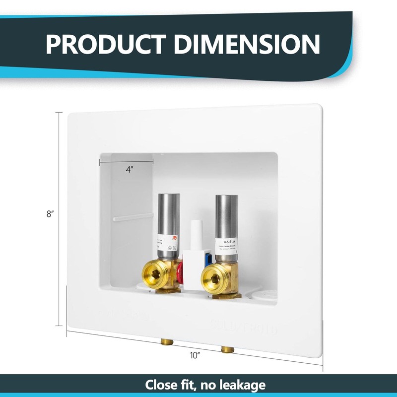 - PACKAGE INCLUDE: 1.washing machine outlet box with a stainless steel water hammer arrestor 2.pre-installed support brackets 3.protective box cover