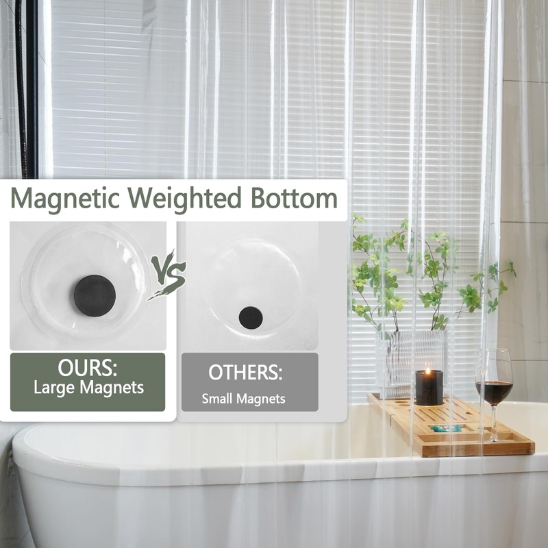 - 【Heavy Duty & 3 Large Magnets】This 54'' vinyl shower stall curtain features 3 weighted magnets at the bottom, which can tightly adhere the liner to the iron containing bathtub wall. If the bathtub you are using does not contain iron, the magnets at the bottom is also essential as it can increase the weight of the shower liner and keep it vertical, making it less susceptible to wind blowing.