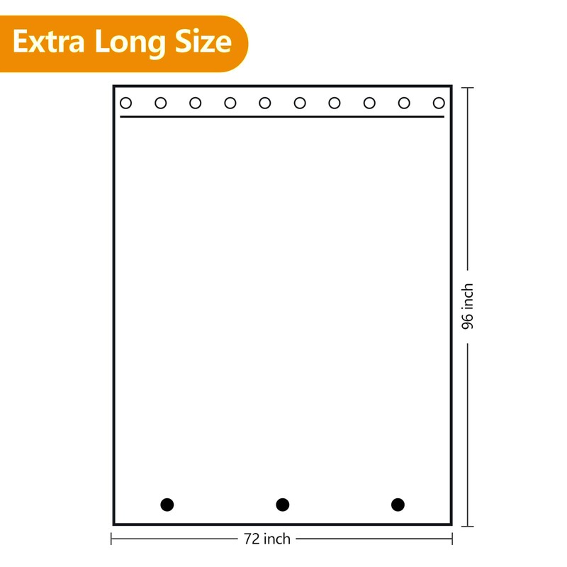 - 【Rustproof Grommets & 12 Hooks】This 72x96 extra tall shower curtain is reinforced with 12 rust-proof stainless steel grommets, making it more durable and less likely to tear. Equipped with 12 plastic hooks for easy installation.
