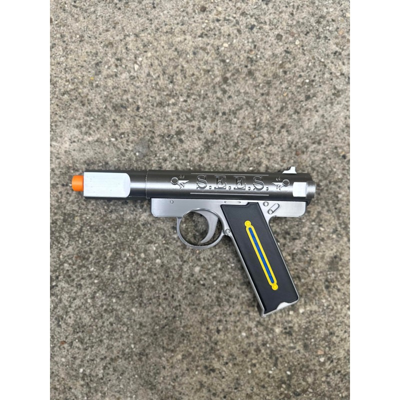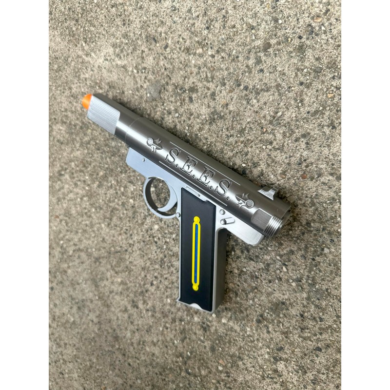Step into the world of Persona 3 with this handcrafted, 3D printed SEES Evoker prop. Modeled with precision and attention to detail, this non-functional replica captures the iconic style of the in-game item, including the engraved “S.E.E.S.” lettering, silver metallic body, and custom grip design with the signature yellow accent. Made using high-quality PLA+ for improved durability and print quality, this piece is both lightweight and sturdy—perfect for cosplay, fan photoshoots, or display. The bright orange barrel tip ensures safety at conventions or public events. Disclaimer: This is a non-functioning, display-only item made for cosplay and collecting purposes. Not a real firearm or capable of firing any projectile.