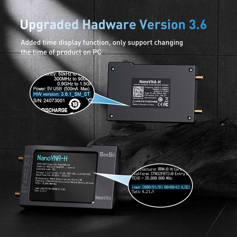 - Upgraded NanoVNA-H HW3.6: The SeeSii NanoVNA-H Vector Network Analyzer, developed by Hugen, features the latest 3.6 version with a 10KHz-1.5GHz measuring range, a 2.8-inch LCD touchscreen, and a compact, portable design. This antenna analyzer offers excellent vector network measurement capabilities, making it ideal for evaluating antenna resonance and SWR. It's a highly portable, intelligent, and user-friendly tool for electronics engineers, amateur radio operators, or DIY radio enthusiasts