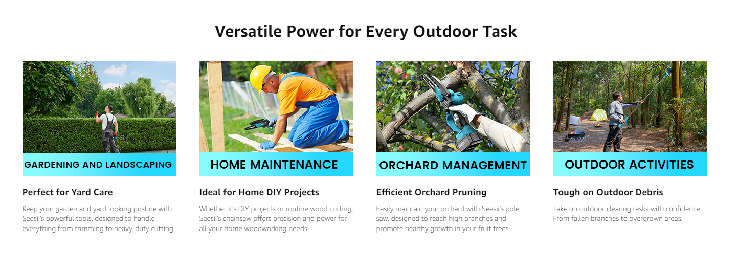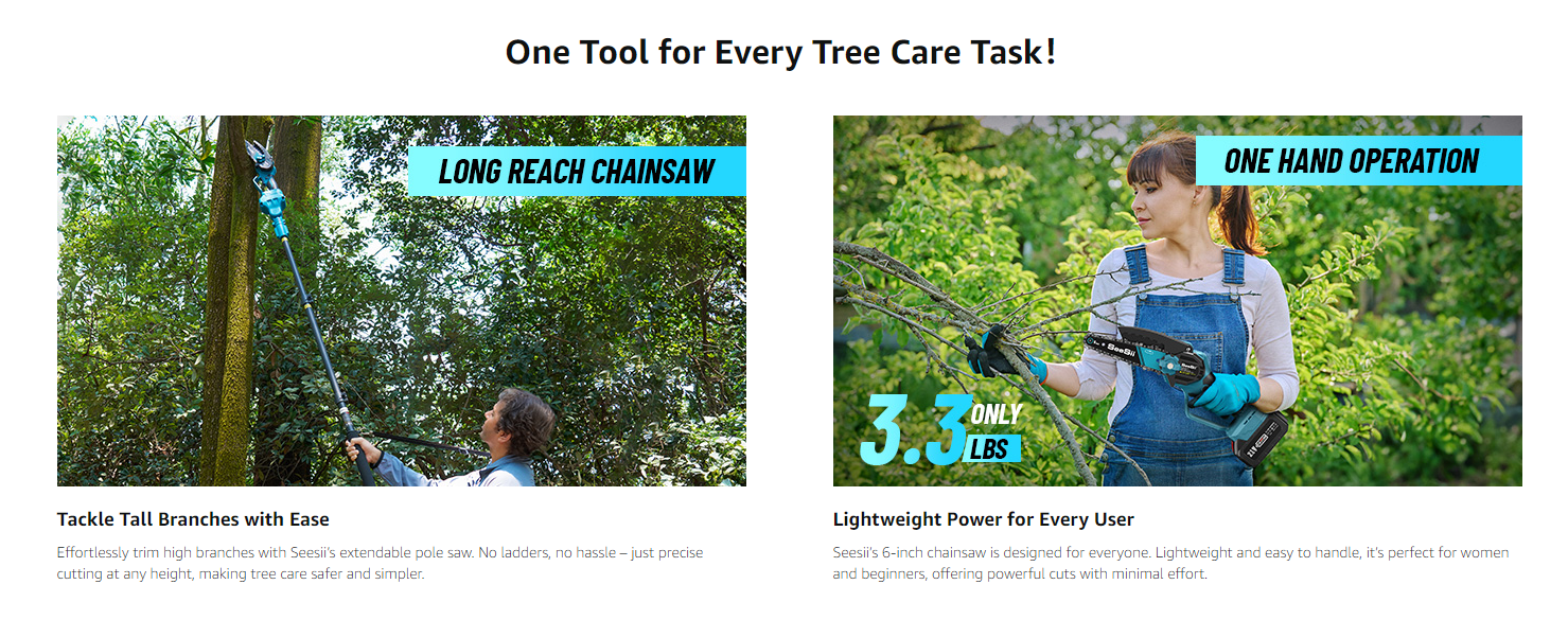- Extendable Pole (4.6 to 10 Feet): The Seesii electric pole saw extends to reach those tough, high spots. With a reach of up to 10 feet, it's ideal for trimming tall trees, acting as a reliable pole saw for tree trimming battery-powered tool