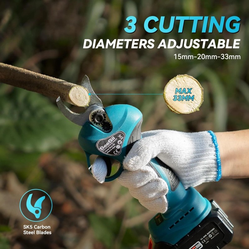 - Precision Pruning with Exceptional Cutting Power: The Seesii electric pruning shear combines high-performance SK5 steel blades with a powerful 21V brushless motor, providing gardeners and landscapers with the precision to tackle everything from delicate vines to robust tree limbs