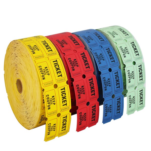 - 2000 Double raffle tickets,each tickets is 2 "x2", and split into 2" x 1"halves. Full Set of 4 rolls, including red, yellow, green and blue.