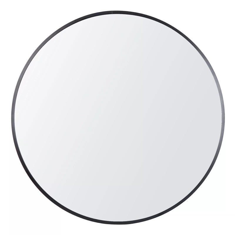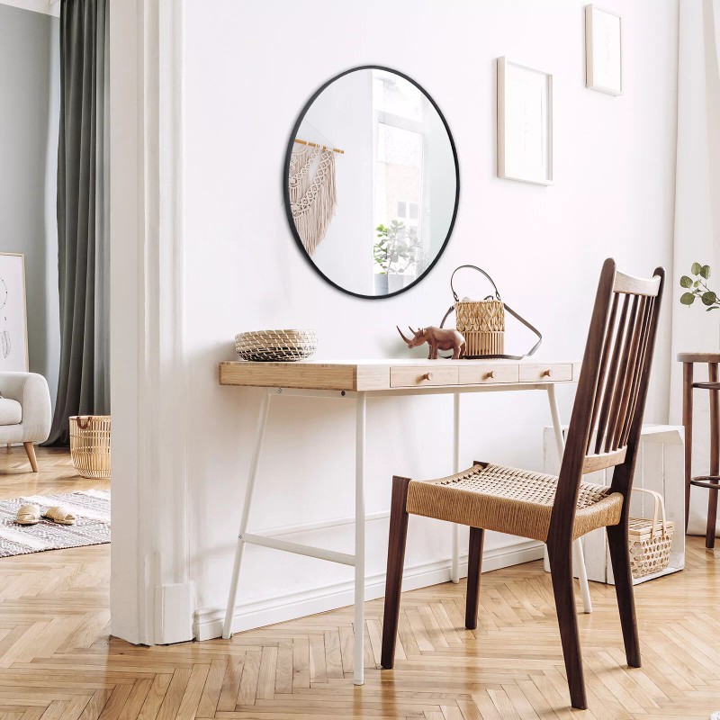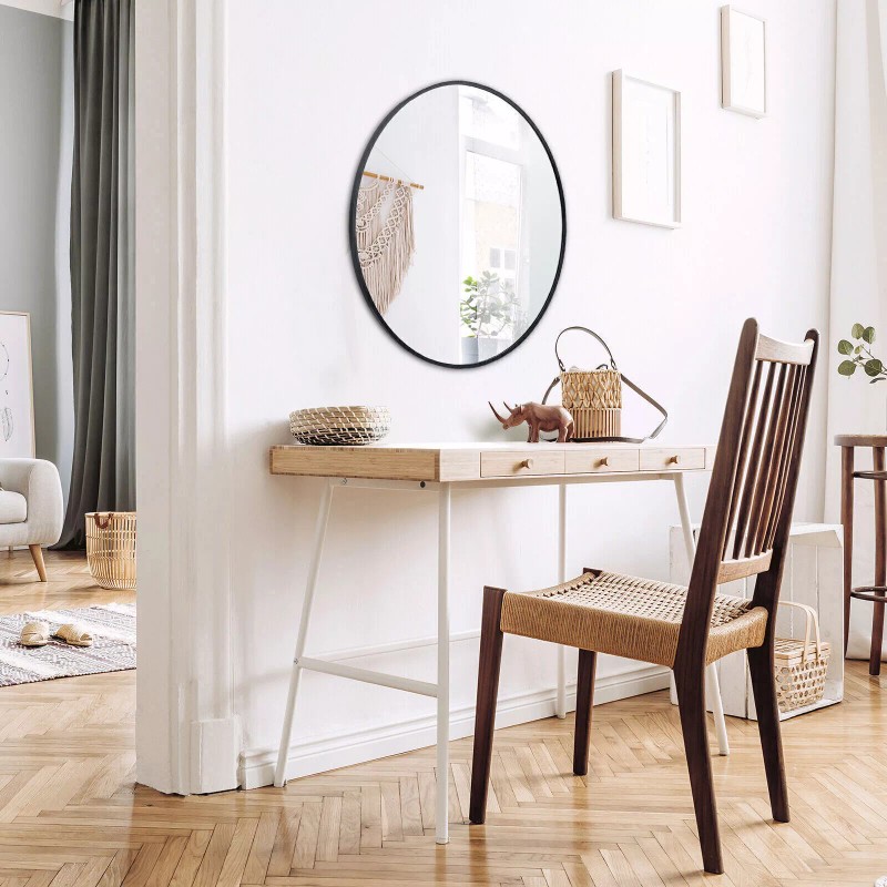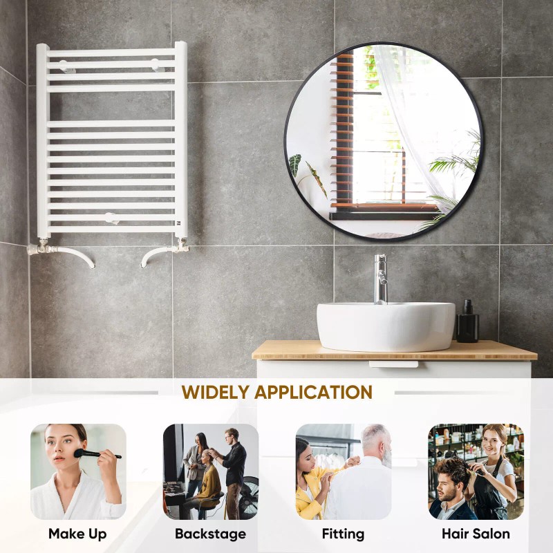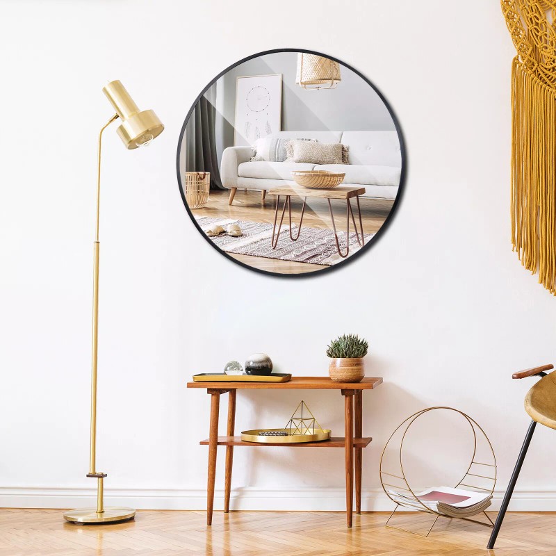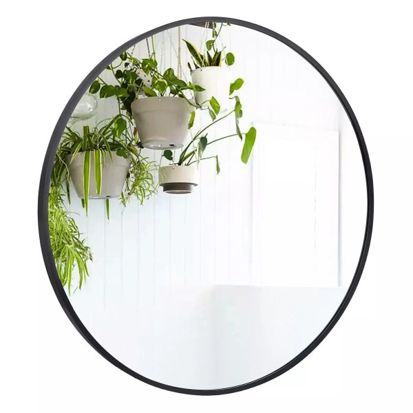 The round alunimum frame mirror is Φ60.2*2.8cm/23.7*1.1 in , which can be meet daily needs. It is ideal for bedroom, livingroom, hallway and bathroom, and it can be a modern but sepctactular make up mirror.
