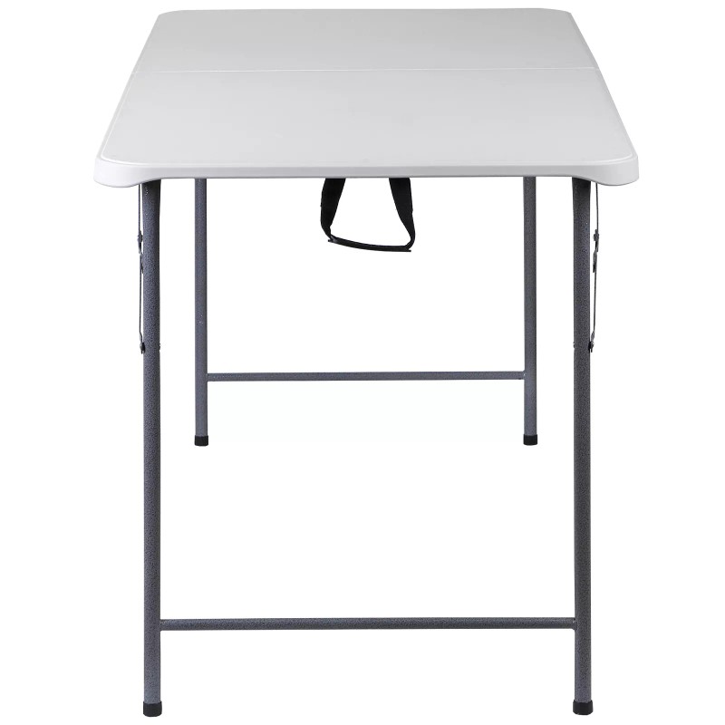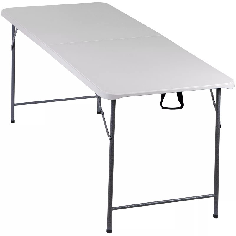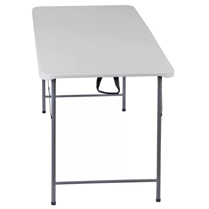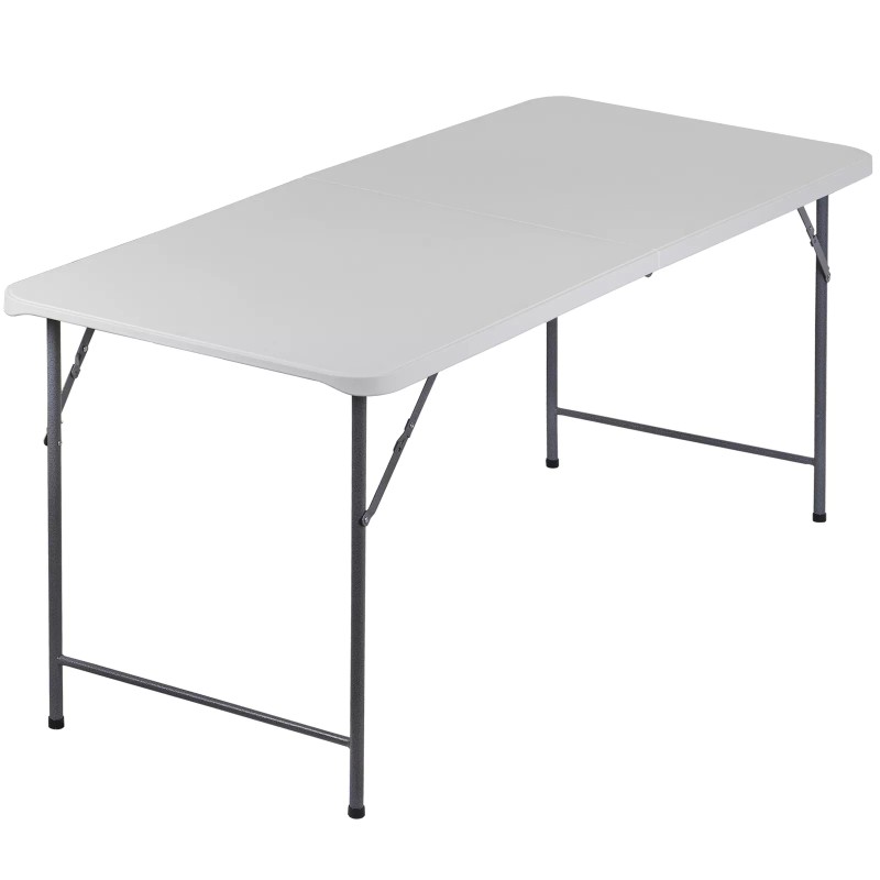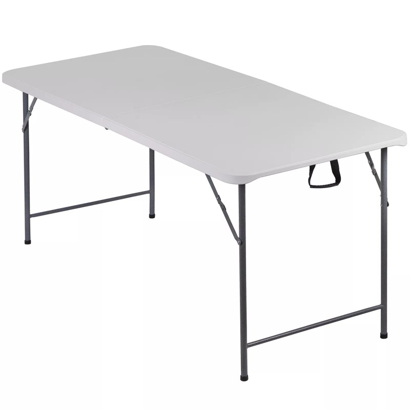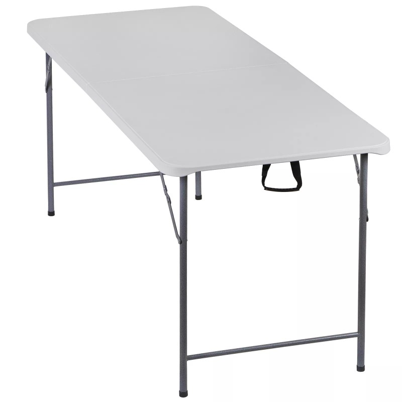 - Foldable Table: This 6 foot folding table can be folded in the middle, buckled with a safety buckle, safe and easy to store. There is a comfortable handle on the edge of the table, more convenient to carry. Easily fits in the car trunk.