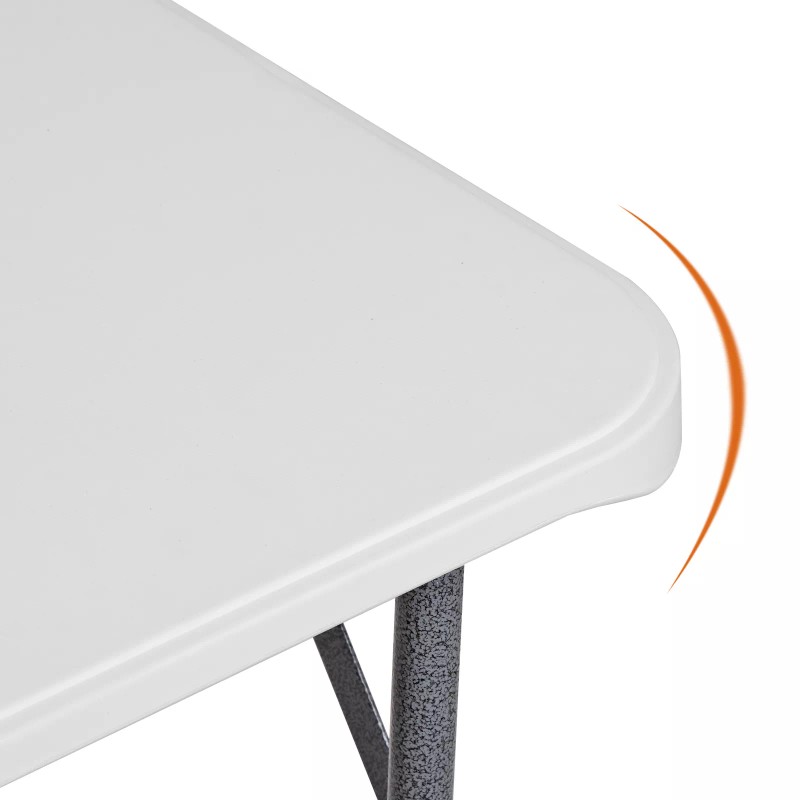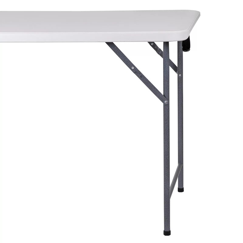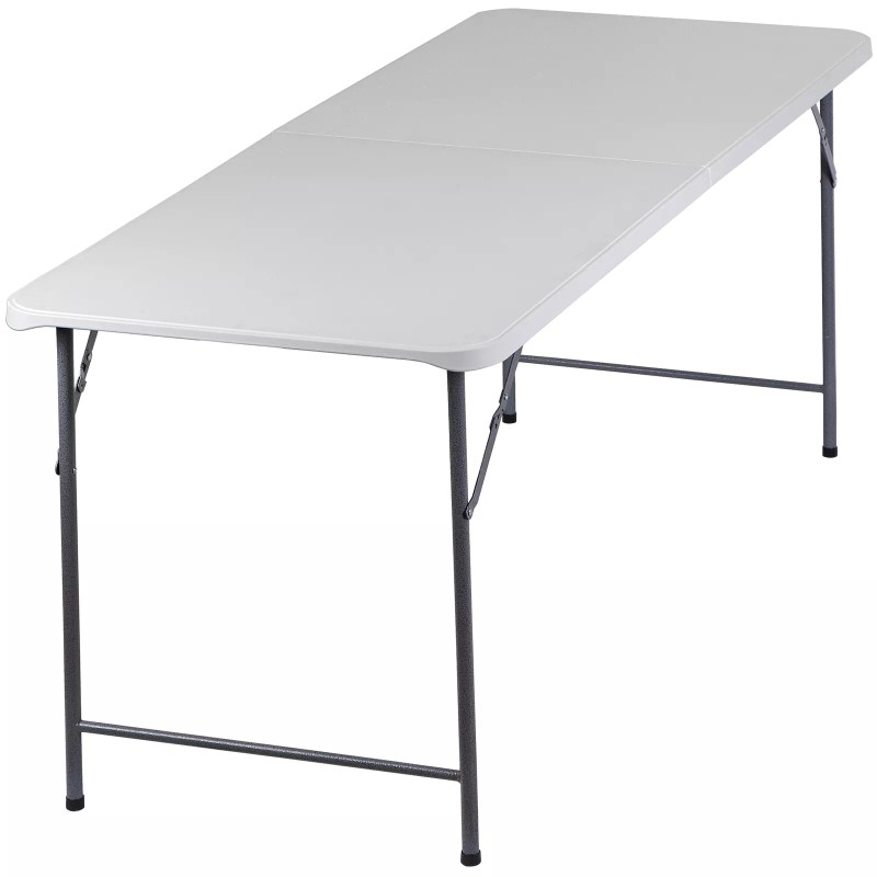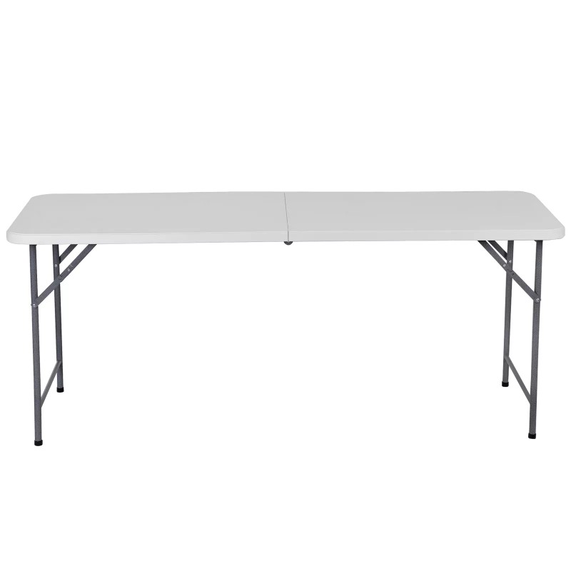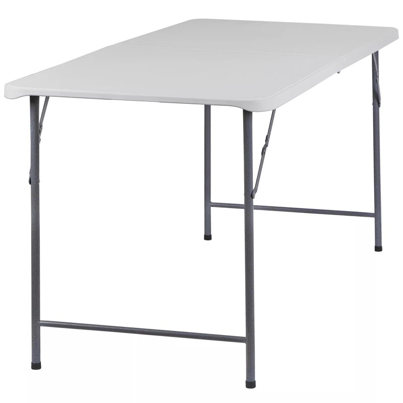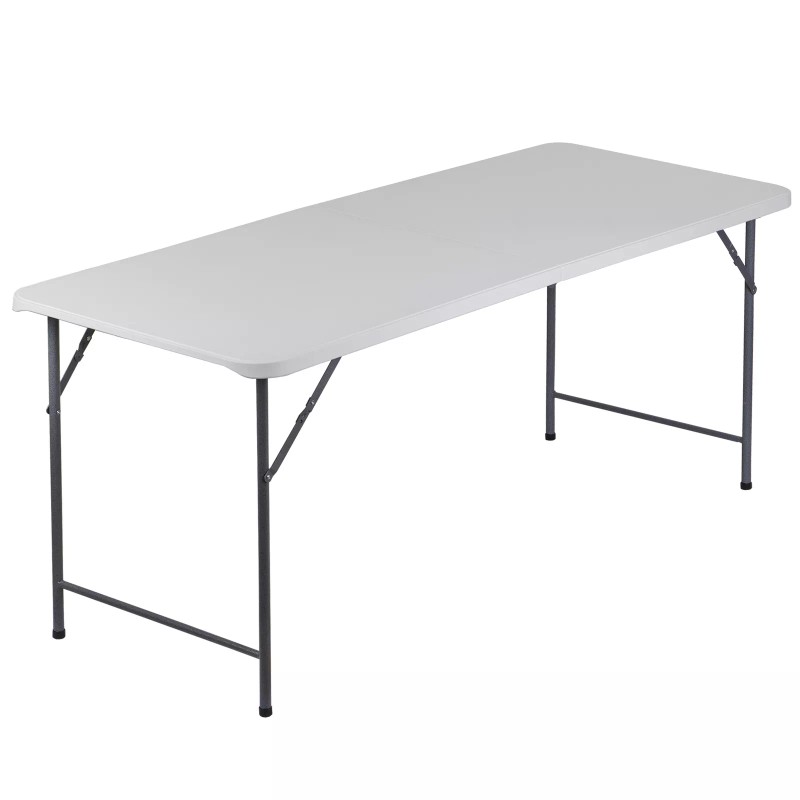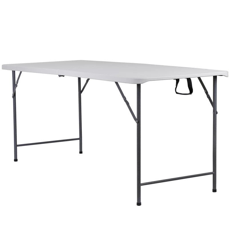 - Foldable Table: This 6 foot folding table can be folded in the middle, buckled with a safety buckle, safe and easy to store. There is a comfortable handle on the edge of the table, more convenient to carry. Easily fits in the car trunk.