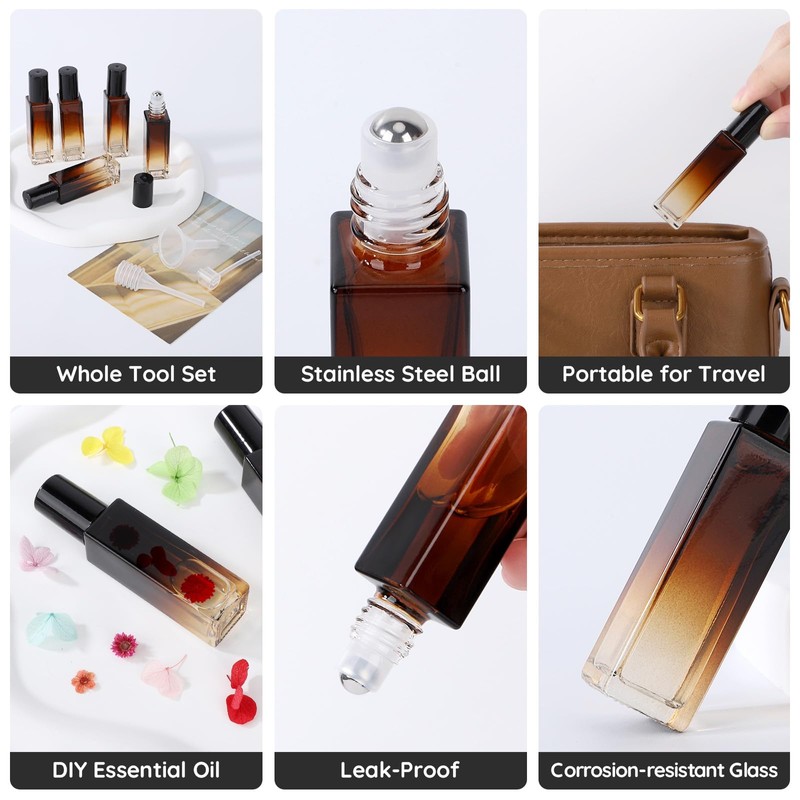 - Package Included: You will get 5pcs 0.34oz/10ml glass roller ball applicator with stainless steel rollerball, essential oils dispensing tool set including funnel, nozzle and dropper, which is convenient for making your own essential oil blends