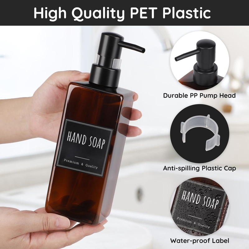 - 4 Bottles & 6 Self-adhesive Stickers: With capacity of 16.9 oz/500 ml, suitable for the daily needs of the whole family. With 6 separate self-labeling waterproof label stickers for SHAMPOO, CONDITIONER,BODY SOAP,HAND SOAP, DISH SOAP, LOTION