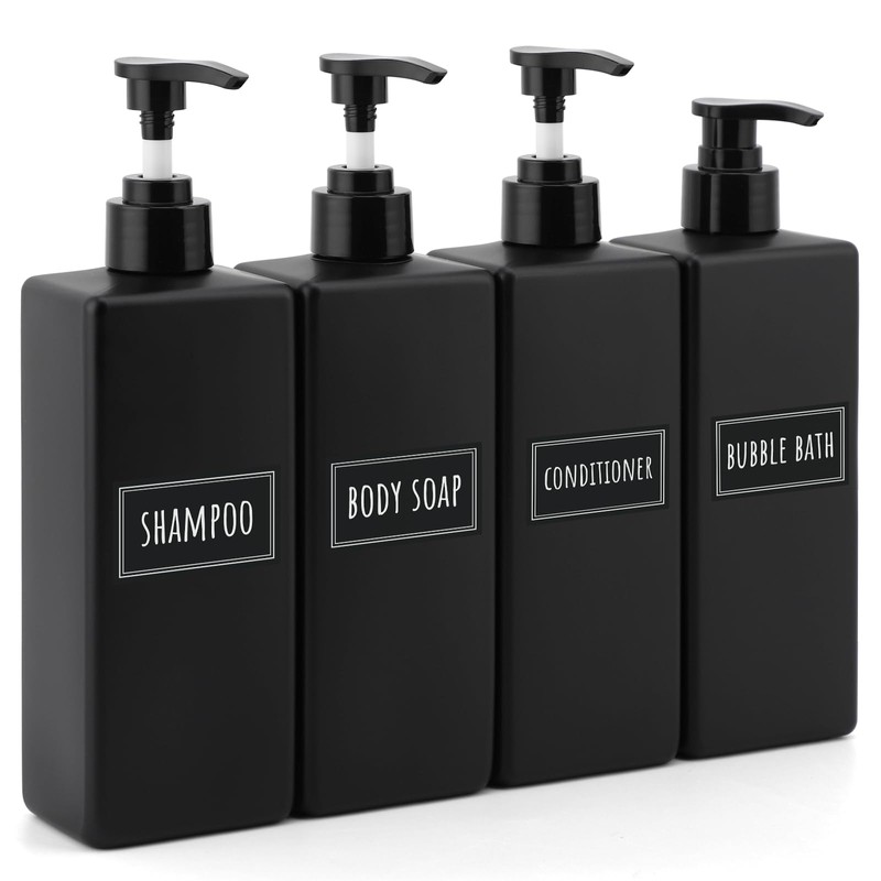 Segbeauty Shampoo Bottles for Filling, Pack of 4 500 ml Soap Dispenser, Matte Black, Plastic Soap Dispenser, Shower Gel Dispenser with Labels, Pump Bottle for Shampoo, Body Soap