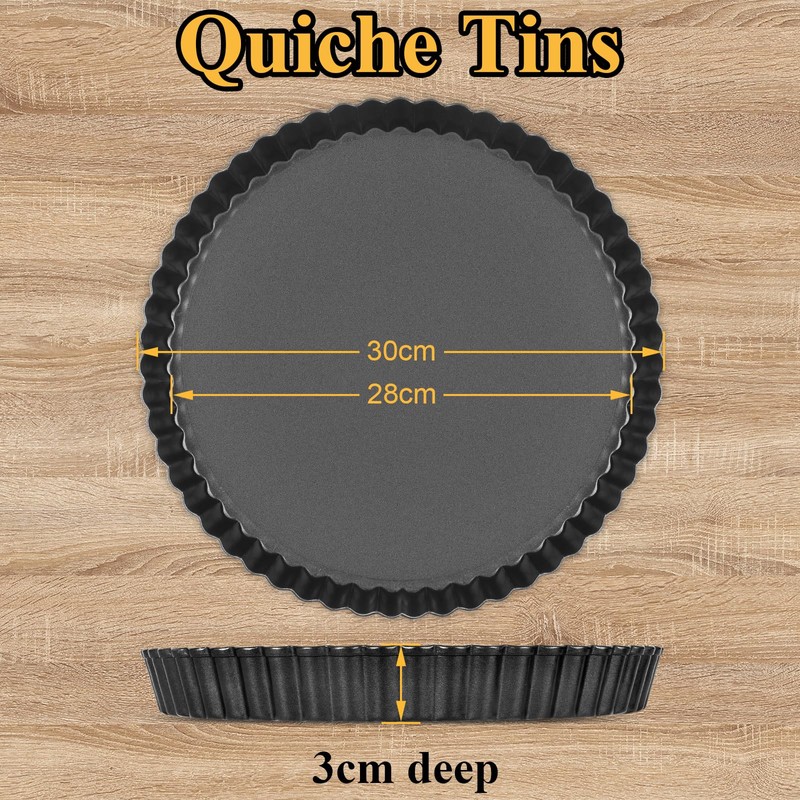 • 30cm Futed Tart Tin – Each quiche tins with loose base measures 30cm(11.8in) top dia. X 28cm(11in) bottom dia. x 3cm(1.2in) deep, with attractive fluted edge, perfect for creating apple pie, mince pies, pumpkin pie, creamy cheese cake, cupcakes, pizza and other delicious desserts in good shape. Make your cooking process fun and let everyone expect the party to come!