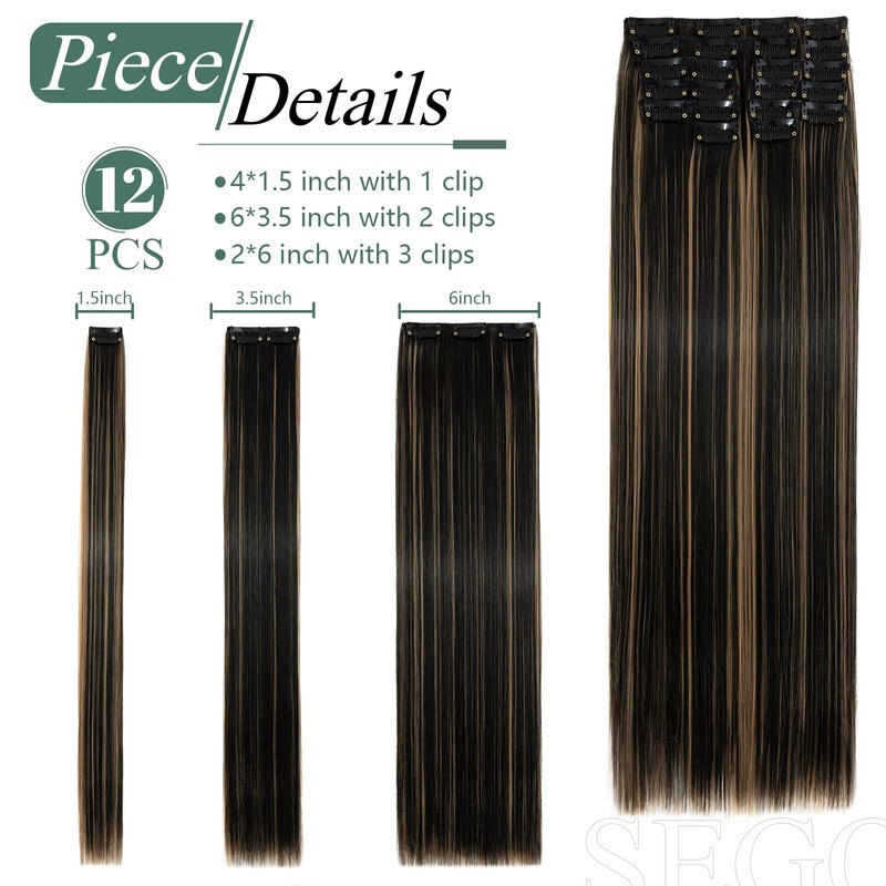 SEGO Clip-In Extensions Like Real Hair Extensions with 22 Clips 55 cm Straight for Full Head 180 g Natural Black & Coffee Brown Pack of 12