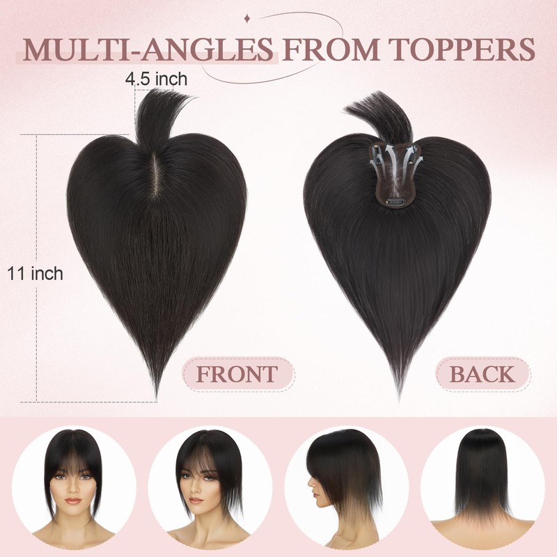 SEGOHAIR Hair Toppers for Women Human Hair 360°3D Coverage Hand-stitched Hair Toppers Clip in Fringe Natural Hair Topper for Thinning Hair Human Hair Add Volume 11inch Black,20g