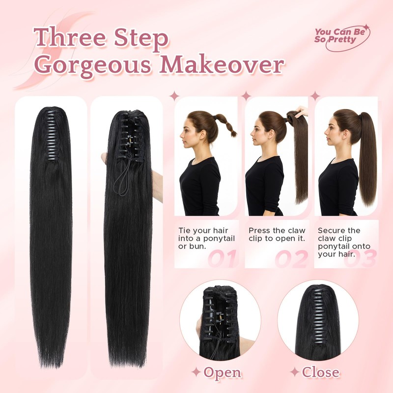 - 30-Second Quick Styling: With our claw clip ponytail extension, achieving a new look takes just 30 seconds. The sturdy claw clip is easy to use, making it a breeze to clip on around your own ponytail. In no time, you'll have a stunning long ponytail extension that transforms your appearance instantly, perfect for those on-the-go moments.