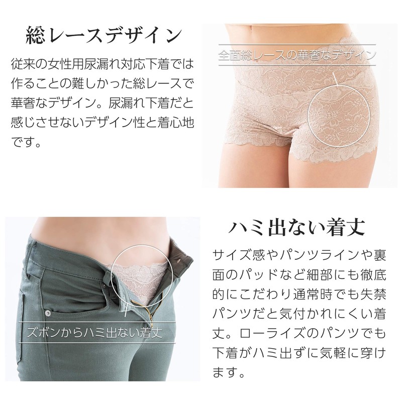 - 1. Segrate urine leakage pants that women all over the world. These stylish urine-leaking pants have been developed by women who have the same trouble and have spent a long time. Available in 2 types: regular and long type with a length of 1.2 inches (3 cm) longer than regular to accommodate leaks that are transmitted. 2. The entire lace design was difficult to make with traditional women’s urine leakage underwear. The absorbent pad part is the same color as the lace, so you won't even notice it even if you hang it with your family's laundry. 3. The material uses "TEIJIN Beloasis Material" for excellent water absorption and deodorization. The fit fits close to the skin and provides a stable feel that you will want to wear it every day. Look that does not show through the pants line; 4. Size: S Hip 32.3 - 35.4 inches (82 - 90 cm); M: Hip 34.3 - 37.4 inches (87 - 95 cm); L: Hip 36.2 - 39.4 inches (92 - 100 cm); Size LL: Hips 3.4 inches (9 inches (9 inches (9 inches (97 - 105 inches (105 cm); Washing instructions: Note: Note: *The water absorbent function, so it is not recommend using a flexible finishing material is not recommended)
