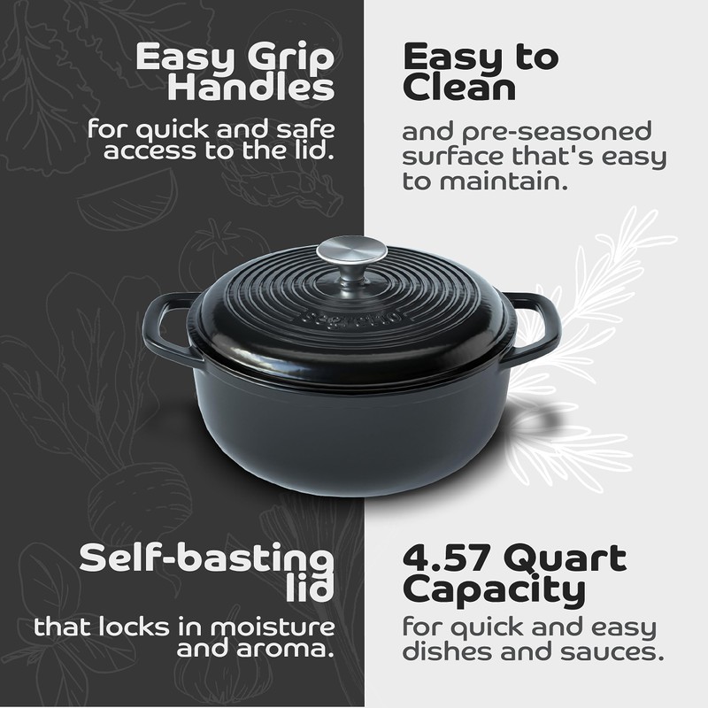 - 4.57 Quarts CAST IRON ENAMELED COOKWARE CAPACITY. Choose the perfect black dutch oven pot with lid for your cooking requirements. This 4.57 Quarts medium-sized oven-safe dutch oven is perfect for 1 to 2-person meals and sizzles a side.