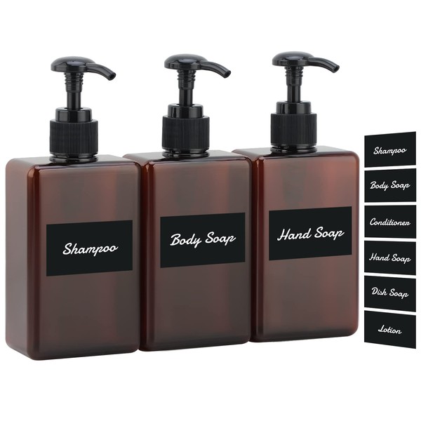 Segus Soap Dispenser, Pack of 3, 280 ml Pump Bottle, Shampoo Bottles for Filling, Soap Dispenser Plastic for Shampoo, Conditioner, Body Soap, Shampoo Dispenser with Sticker, Amber