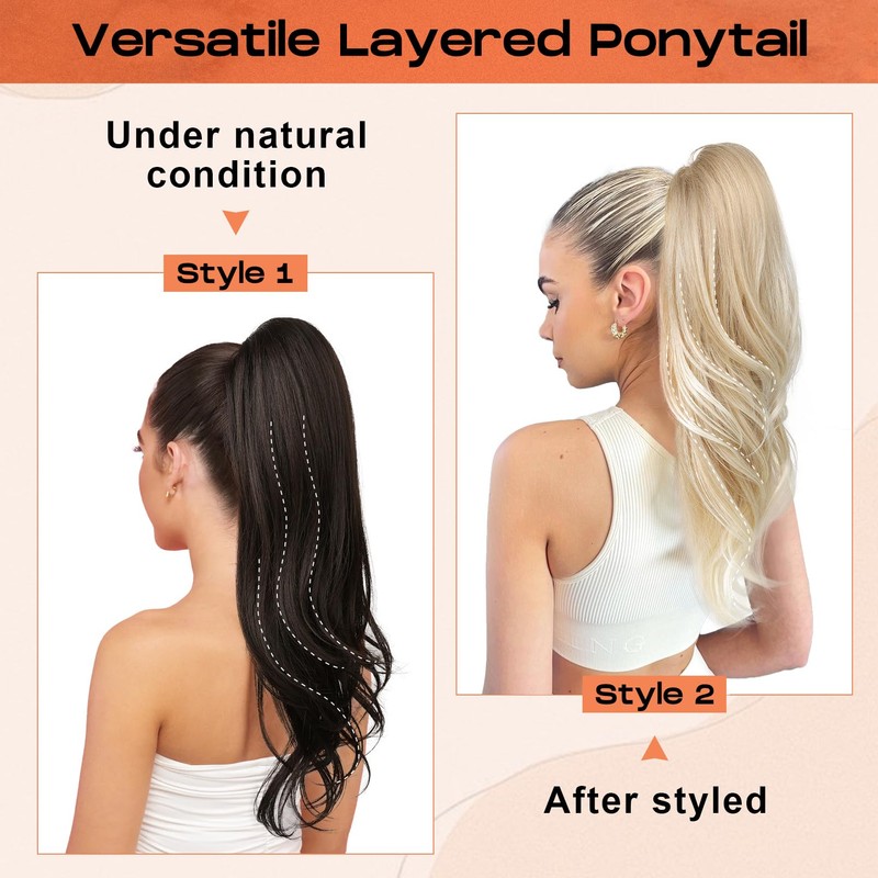 - 💖Versatile Multi Layered Design - The drawstring ponytail extension features a multi-layered hair tail design, which gives the pony tails hair extensions 2 shape, natural wavy under natural condition and multi layered wavy after styled. Wear it and you get a realistic and natural look! Length: 18 inch/46cm, Weight: 140g/4.9oz