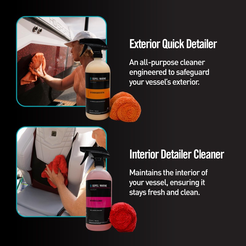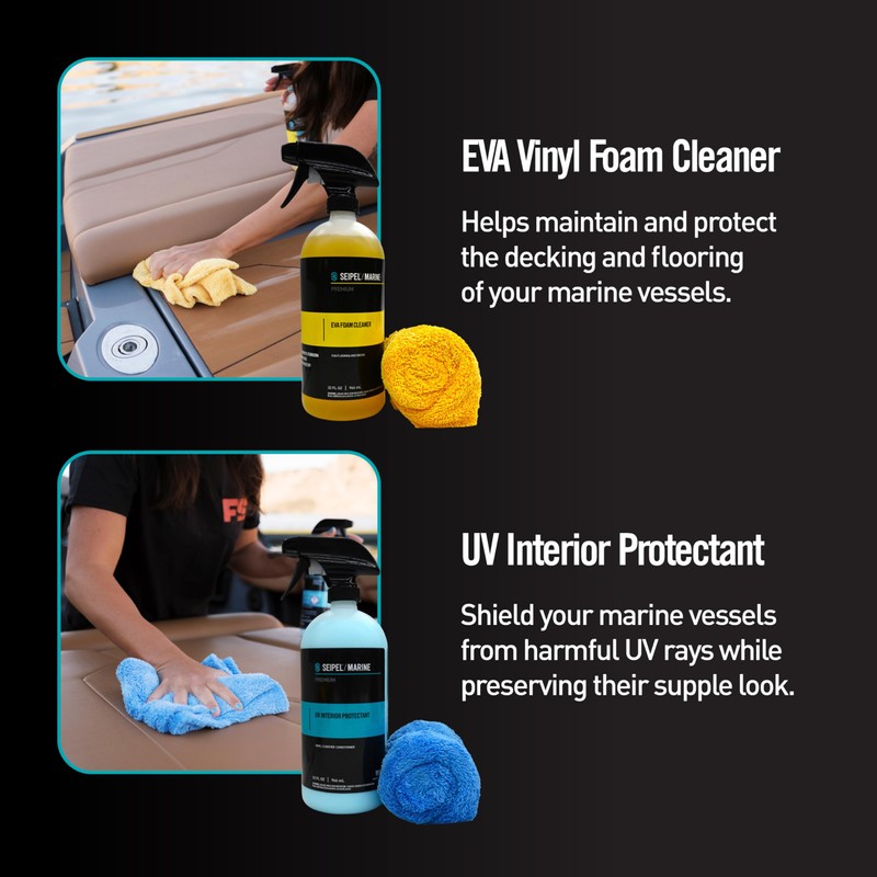 Seipel Marine 4 Pack Premium Boat Cleaners Kit - Includes 4 x 32 oz Cleaners with 4 Matching Microfiber Towels - Interior, EVA Foam, Exterior, UV Protectant - All-Purpose Cleaning for Boats