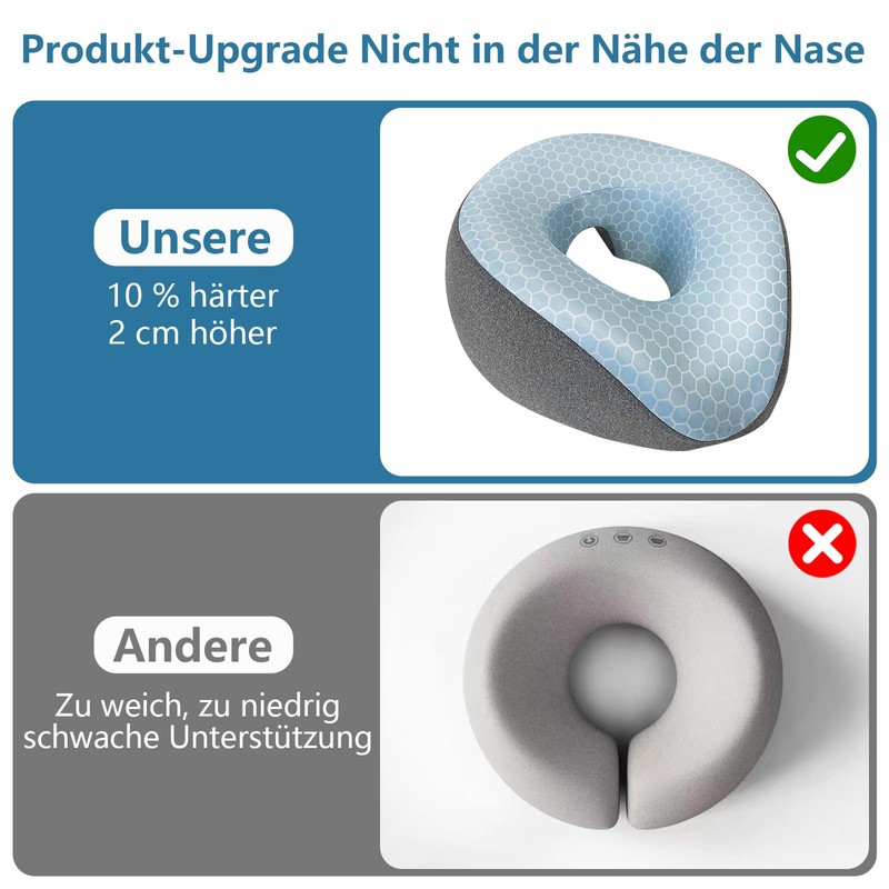 - INNOVATIVE UPGRADE FOR MAXIMUM COMFORT With a 2 cm raised cushion surface and a 10% increased hardness of memory foam, our pillow ensures that your face is not squeezed and unhindered breathing is ensured